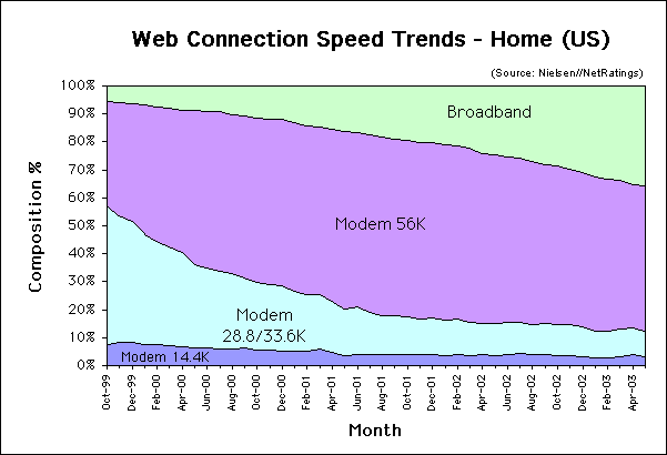 As of May 2003, most users in the US connect to the Internet using dial-up modems of 56Kbps or less. 51.6% use 56Kbps modems, 9.32% use 28/33.3Kbps, and 3.2% use 14.4Kbps modems. In total, 64.13% of home users in the US connect to the Internet at 56Kbps or less (see Figure 1).