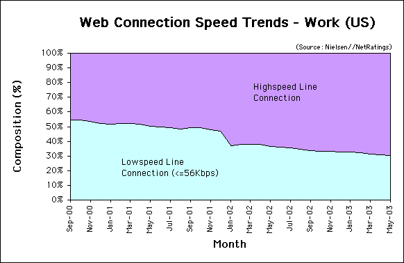 Most workers in the US enjoy high-speed connections to the Internet. Most use a high-speed line such as a T1 connection, and share bandwidth between computers connected to a network. The speed of each connection decreases as more employees hook up to the LAN. As of May of 2003, of those connected to the Internet, 69.7% of US users at work enjoy a high-speed connection, up from 69.3% in April. 30.3% connect from work at 56Kbps or less (see Figure 3).