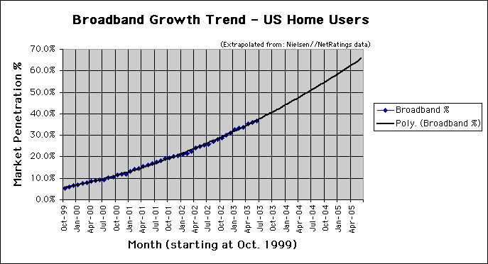 Broadband penetration in US homes increased by 0.83 percentage points in June. As of June 2003 broadband penetration was at 36.7%, up from 35.87% in May. This is higher than the average increase in broadband of 0.72 percentage points per month from October 1999 to May 2003. Extrapolating the data provided by Nielsen//NetRatings, broadband share in the US should exceed 50% by June of 2004 (see Figure 2).