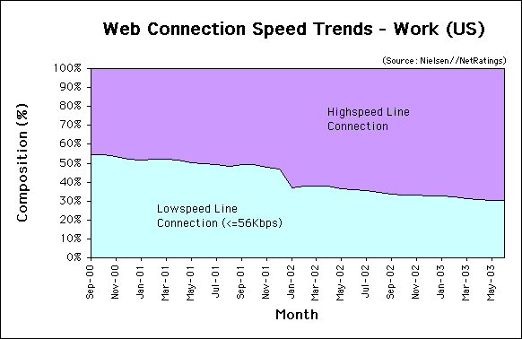 Most workers in the US enjoy high-speed connections to the Internet. Most use a high-speed line such as a T1 connection, and share bandwidth between computers connected to a network. The speed of each connection decreases as more employees hook up to the LAN. As of June of 2003, of those connected to the Internet, 69.8% of US users at work enjoy a high-speed connection, up slightly from 69.7% in May. 30.2% connect from work at 56Kbps or less (see Figure 3).