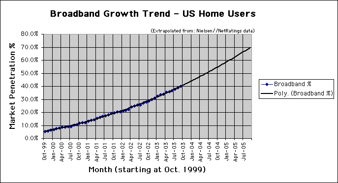 Broadband penetration in US homes increased by 1.09 percentage points in September. As of September 2003 broadband penetration was at 40%, up from 38.9% in August. This is higher than the average increase in broadband of 0.72 percentage points per month from October 1999 to August 2003. Extrapolating the data provided by Nielsen//NetRatings, broadband share in the US should exceed 50% by June of 2004 (see Figure 2).