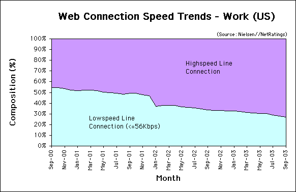 Most workers in the US enjoy high-speed connections to the Internet. Most use a high-speed line such as a T1 connection, and share bandwidth between computers connected to an ethernet network. The speed of each connection decreases as more employees hook up to the LAN. As of September of 2003, of those connected to the Internet, 72.8% of US users at work enjoy a high-speed connection, up 0.6% from 72.2% in August. 27.2% connect from work at 56Kbps or less (see Figure 3).