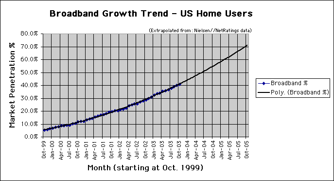 Broadband penetration in US homes increased by 0.95 percentage points in October. As of October 2003 broadband penetration was at 40.9%, up from 40% in September. This is higher than the average increase in broadband of 0.73 percentage points per month from October 1999 to September 2003. Extrapolating the data provided by Nielsen//NetRatings, broadband share in the US should exceed 50% by June of 2004 (see Figure 2).