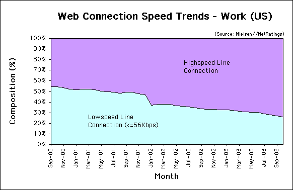 Most workers in the US enjoy high-speed connections to the Internet. Most use a high-speed line such as a T1 connection, and share bandwidth between computers connected to an ethernet network. The speed of each connection decreases as more employees hook up to the LAN. As of October of 2003, of those connected to the Internet, 74.1% of US users at work enjoy a high-speed connection, up 1.3% from 72.8% in September. 25.9% connect from work at 56Kbps or less (see Figure 3).