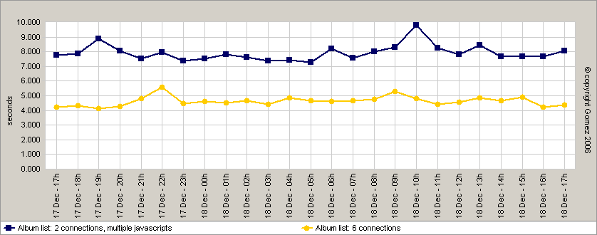 Ryan Breen of Gomez found that moving from two to six simultaneous connections improved the load time of a sample