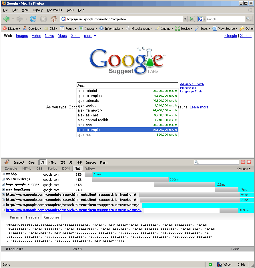 Figure 8-2. Google suggestions courtesy of Ajax requests