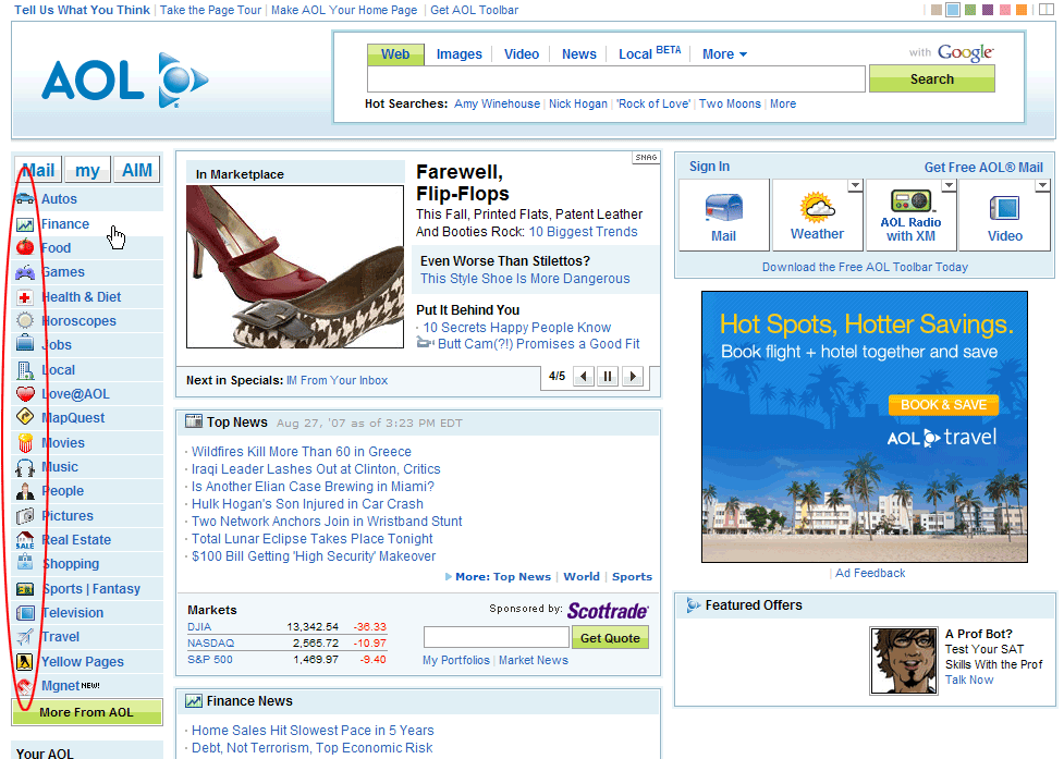 AOL.com uses CSS sprites on its home page to improve performance. AOL uses a CSS sprite for the icons in its main directory navigation bar (Autos, Finance, Food, etc.) on the left side of its home page (see Figure 7-5).