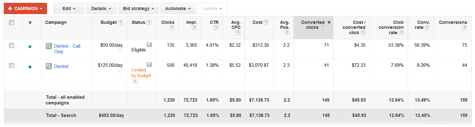 The results of the "Dentist" call only campaign are shown in Figure 3. The conversion rate of the call only campaign is 56.4%, while the conversion rate on the old Dentist campaign (same keywords) is 8.3%. The cost per converted click is $4.35 for the call only campaign and $72.33 for the old Dentist campaign (no call only), some 16.6 times higher. Overall the call only campaign generates more calls at 1/10 the cost.