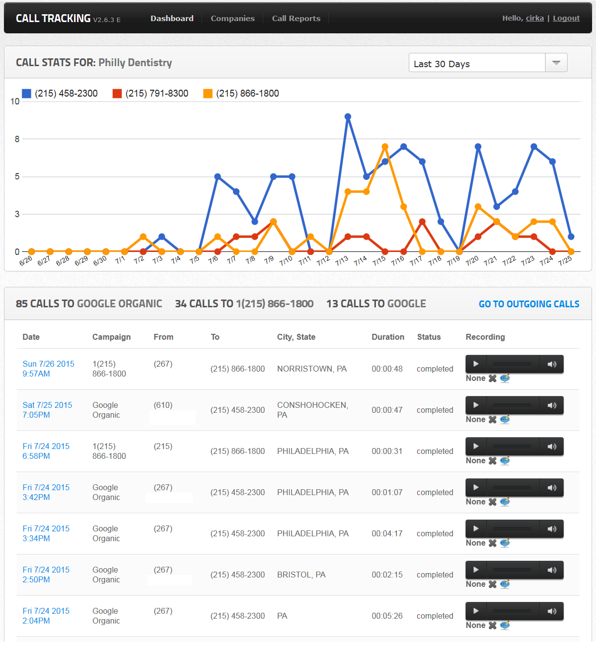 A total of 102 emails were generated from the website during the time period in question. 69 of which were from organic traffic, 14 from paid traffic, and 19 emails were from direct traffic. Note that 68 emails were from mobile devices. Note also that the conversion rate of organic traffic was 4.38 times greater than PPC traffic (5.44% vs. 1.24%). Putting it all together let's calculate the cost per lead and cost per call. Figure 3 shows the cost per lead (calls + emails) for both organic and PPC advertising. Each organic lead costs $7.60 and each PPC lead costs $106, some 14 times more than natural. The leads section shows that even though Dr. Cirka is spending 9.8 times more on PPC than natural, he is getting only 70% of the leads that natural generates (107 leads for PPC vs. 153 leads for natural). We attribute the better performance of natural PR to PPC to the higher conversion rate of natural versus PPC (4.4X more likely to email, and 6.2X more likely to call onsite), the higher preference for selecting natural results on search engines (70-85% click on natural results vs. PPC), and the trend we've seen of increasing PPC cost per click versus the decreasing cost of natural SEO leads over time as backlinks accumulate. Figure 4 shows the cost per call for PhillyDentistry.com. The cost for a PPC call (both on and off-site) is $122 per call, while the cost per call for natural is $13.8, some 8.8 times less than PPC. Looking at only the calls generated from the website the difference is nearly 8 times larger. The cost of an onsite PPC call is $945, while the cost of an SEO call is only $14, a ratio of 68.4 to 1. 65.2% of the visitors to phillydentistry.com were on a mobile device, and 66% of the email leads were from mobile. For PPC advertising, 90.1% of the calls were from smartphones, and 9.9% were from desktop computers. Some highlights of this study are as follows: Our recommendations are as follows: Based on this lead tracking data, it is clear that organic advertising is more efficient than PPC advertising at generating leads. In fact, in this case a PPC lead cost about 14 times more than a natural lead. Dr. Cirka could actually spend less money and get more leads by shifting some of his PPC budget to natural, and shifting his remaining PPC budget to mobile ads.How Phone Call Tracking Works