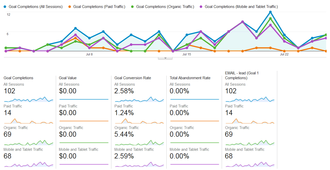 Next you surround each (non-fax) phone number with a <span></span> tag thus: That's it! Now once a user accesses your site, the phone number will change depending on the source (say Google natural, Google PPC, and direct). Dr. Ken Cirka of PhillyDentistry.com kindly volunteered to use let us use his results for this case study. After less than a month of tracking phone calls, the results for PhillyDentistry.com are shown in Figure 1. The blue (2300) line are Google Natural calls, the orange (1800) line are direct calls (bookmarked, link, direct), and the red (8300) line are Google PPC calls. You can see the organic calls dominate the paid calls (more on this later). To capture all the calls from Dr. Cirka's online marketing campaigns we enabled call extensions and forwarding numbers on Google Adwords. These "off-site" calls come from people manually calling the phone number from the ad, or clicking on the ad's phone number on a mobile device. 81 calls were generated from PPC ads on Google, 73 of which were from smartphones, and 8 from desktop computers. During the same time period, we used Google Analytics to track email leads generated by the PhillyDentistry.com website.