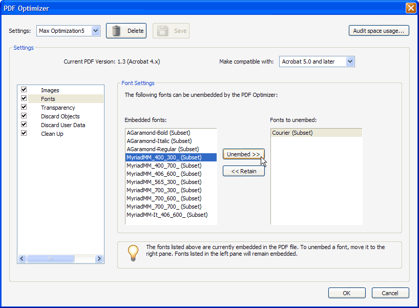 Once you've finished tweaking your PDF optimizer settings you can save them for reuse for subsequent PDFs (see Figure 10). Save your optimized PDF as a new file to compare it to the original. Table 2 shows a comparison of different optimization settings for Chapter 2 of Speed Up Your Site in Acrobat 7 Pro, saved in different PDF versions. The first column of sizes is for the subsetted font version of the file (starting at 123K for the original partially-optimized file). The second column is for the refried version without embedded fonts. The third column shows the outlined version of the first version. The refried version optimized in Acrobat 7 Pro for Acrobat 5 compatibility is the one we'd use for the Web, at 96.6K it is 21.5% smaller than the original. The outlines-only Acrobat 5-compatible PDF is over 50% smaller than the original subsetted version (60.8K versus 123K) but has some font fidelity issues. Note that "compress entire file" shaves 11% to 20% off of PDF file size, but is not compatible with Acrobat 5.
