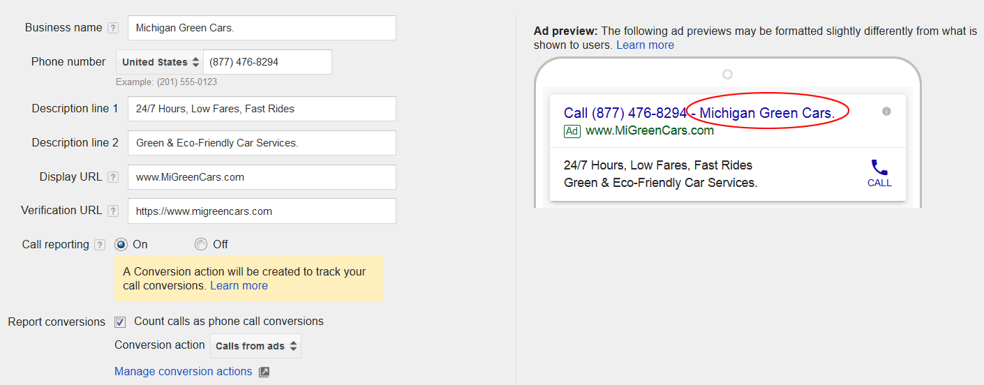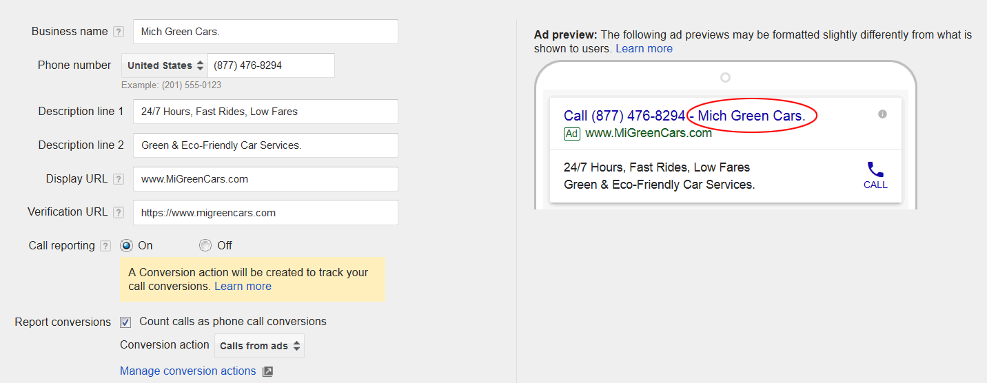 The Business Name is "Michigan Green Cars." The ad above converted well (over 90%) but the cost per conversion (i.e., a call) was $1.61. Abbreviating the word "Michigan" to "Mich" produced this otherwise identical ad (see Figure 2).