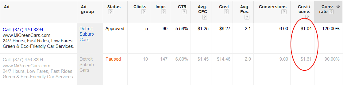 While the abbreviated ad has a slightly lower clickthrough rate, the CPC is 13.8% lower ($1.45 to $1.25) and due to the higher conversion rate the cost per call is 35.4% lower ($1.61 to $1.04/call, see Figure 3).